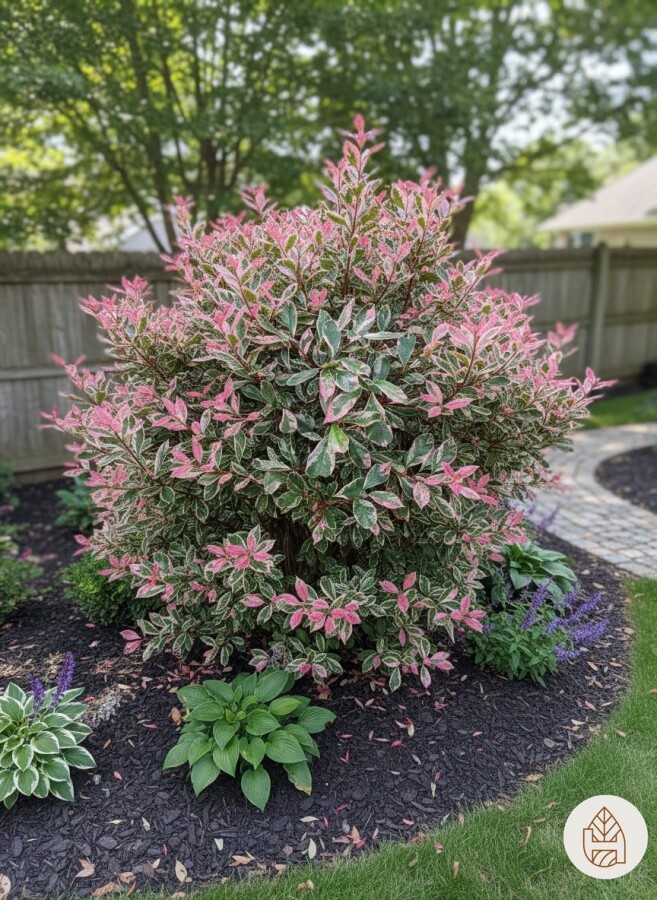 - Photinia fraseri 'Pink Marble' kan enkelt kombineras med andra växter som lavendel och prydnadsgräs för en harmonisk trädgård.