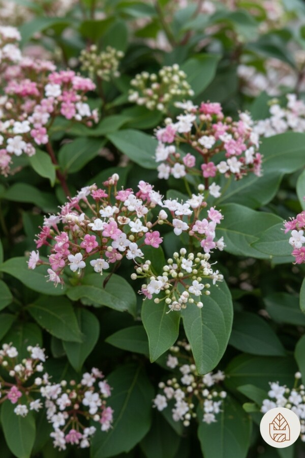 Trädgårdsväxter som Viburnum tinus 'Lisa Rose' är ett utmärkt val för trädgårdar tack vare dess vintergröna egenskaper och långa blomningsperiod.