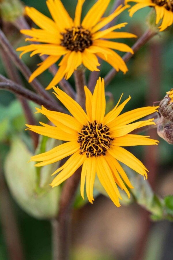 Ligularia dentata, känd som Ligularia i Sverige, är en imponerande växt med ett upprätt växtsätt. Den kan nå en höjd av upp till 120 cm och har en bredd som varierar beroende på växtplats. Bladen är stora, gröna och känns släta vid beröring, vilket ger ett frodigt intryck. Ligularia är inte vintergrön, vilket innebär att den tappar sina blad under vintern. Denna växt är relativt lättskött och passar bra i både soliga och halvskuggiga lägen. Ligularia är ett utmärkt val för trädgårdar där man vill ha en robust och dekorativ växt.